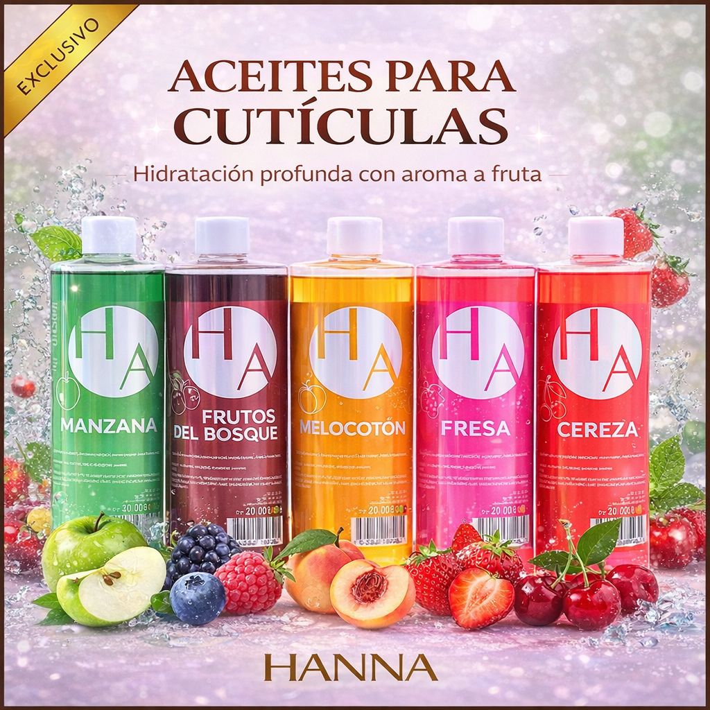 Aceite de cuticula de 500ml, en 5 olores diferentes, ideal para hidratar las cuticulas despues de limpiarlas, apto para uso diario.