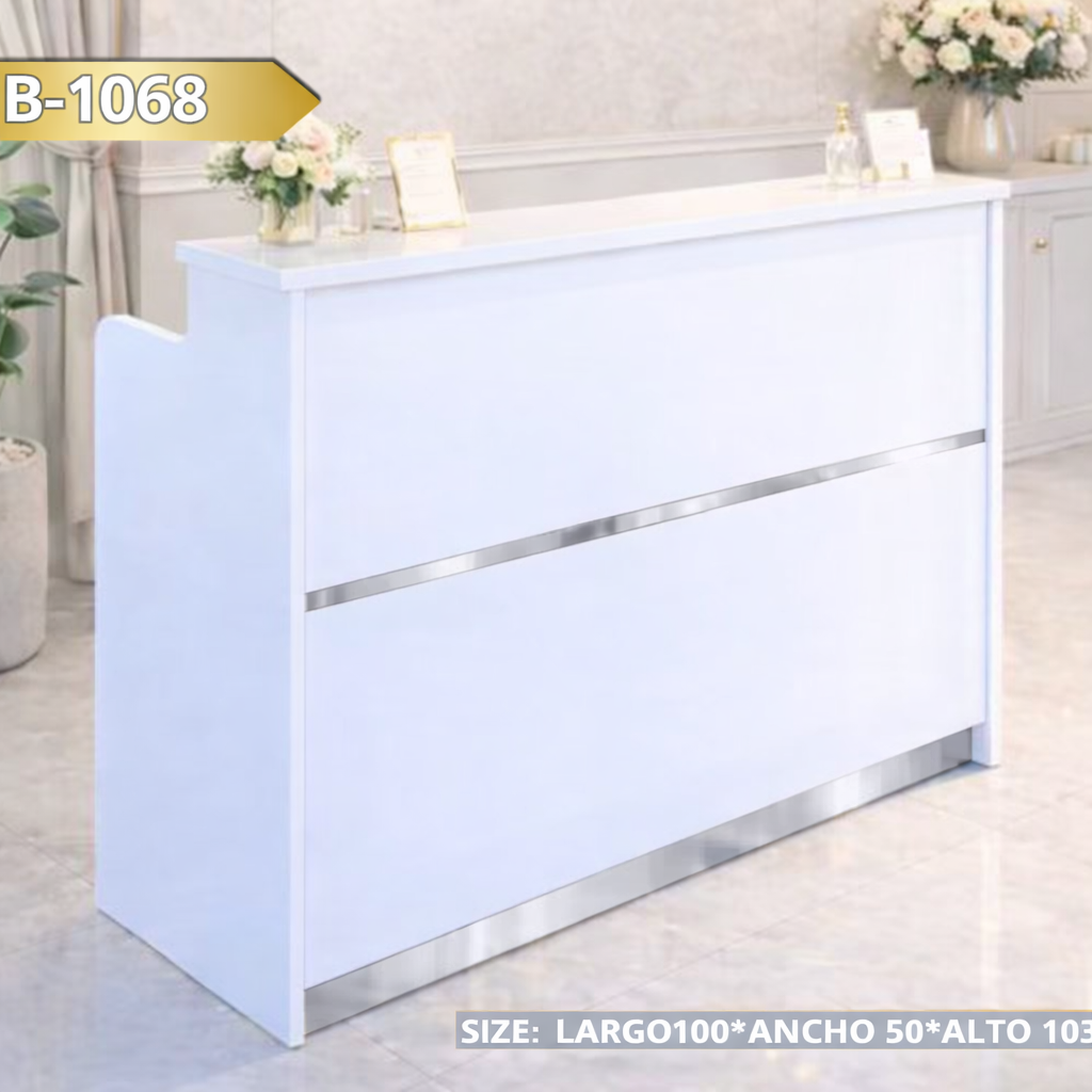 • ✅ Mostrador de melanina con acabado laminado blamco y detalles en color dorado  ideal para todo tipo de negocios, recepciones y salas de espera.